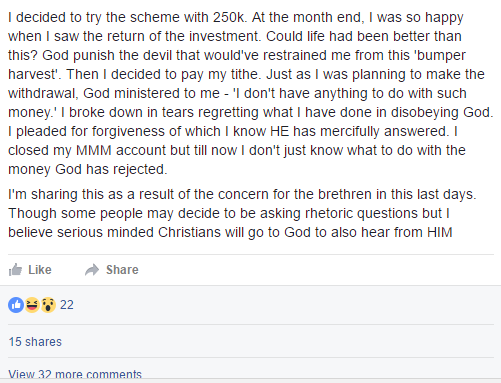 A certain Facebook user, Akande Thomas, has shared the experience of an MMM participant who claims God rejected his tithe from MMM earnings and clearly told him Christians involved in the scheme have had their names removed from the book of life.